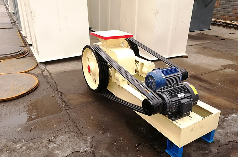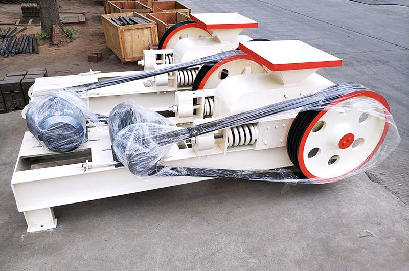 是由两个电动机,通过三角皮带传动到槽轮上拖动辊轮,按照相对方向运动旋转。在破碎物料时,物料从进料口通过辊轮,经碾压而破碎,破碎后的成品从底架下面排出。
